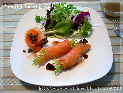 1) 取一片燻鮭魚鋪平,將洋蔥司及生菜放入捲起 (做兩份)